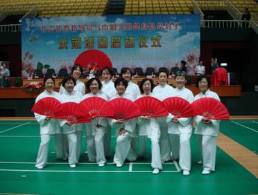 北京市海淀区的巾帼文明健身队表演了太极功夫扇,充分展示近年来妇女健身活动的丰硕成果。